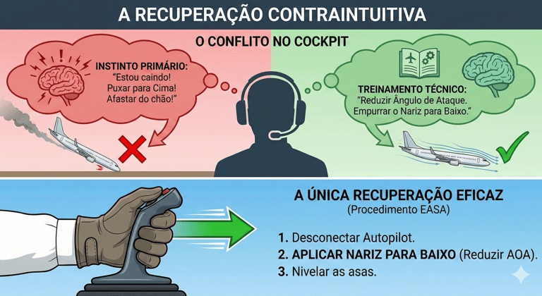 Essa ação é profundamente contraintuitiva. Empurrar o nariz em direção ao solo quando a aeronave já está caindo parece fundamentalmente errado. Isso desafia o instinto humano poderoso e primário de se afastar do solo ao cair, um instinto que pode sobrepor centenas de horas de treinamento em um ambiente de alto estresse e "sobressalto" (startle). No entanto, é a única maneira de restabelecer o fluxo de ar suave sobre as asas e recuperar a sustentação. A Agência da União Europeia para a Segurança da Aviação (EASA) define um procedimento de recuperação simples e universal: