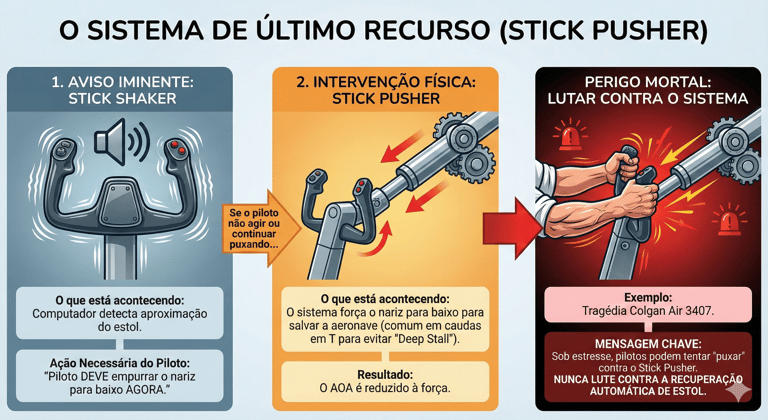 Este é um recurso de segurança crítico, especialmente em aeronaves com cauda em "T", que podem ser suscetíveis a um perigoso "estol profundo" (deep stall). O acidente de 2009 do voo Colgan Air 3407 é um exemplo gritante de como esse sistema pode ser tragicamente mal compreendido. O comandante respondeu inadequadamente ao stick shaker e depois lutou ativamente contra a ação salvadora do stick pusher, um exemplo trágico de como a fixação induzida pelo estresse pode levar um piloto a combater o próprio sistema projetado para salvá-lo.