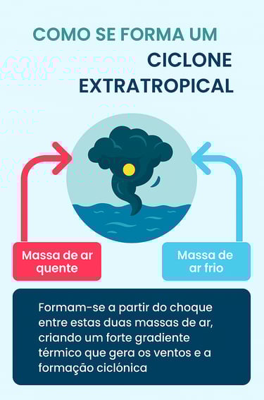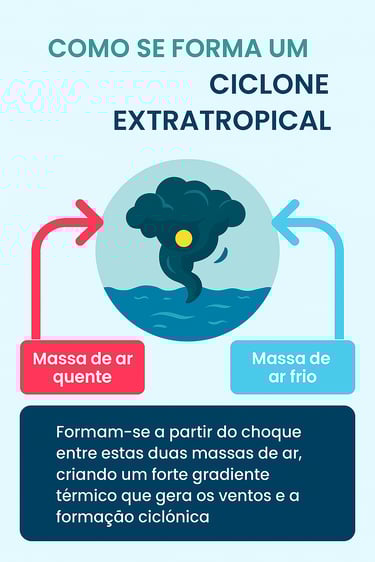 Ciclones extratropicais são sistemas meteorológicos de grande escala, caracterizados por serem áreas de baixa pressão atmosférica que se formam fora das regiões tropicais, geralmente em latitudes médias, entre 30° e 60°. Eles são responsáveis por mudanças abruptas no tempo, como ventos fortes, chuvas intensas, queda de temperatura e, em alguns casos, até neve. No Hemisfério Sul, os ventos ao redor do centro do ciclone giram no sentido horário, enquanto no Hemisfério Norte o giro é anti-horário, devido à influência da força de Coriolis, que resulta do movimento de rotação da Terra.