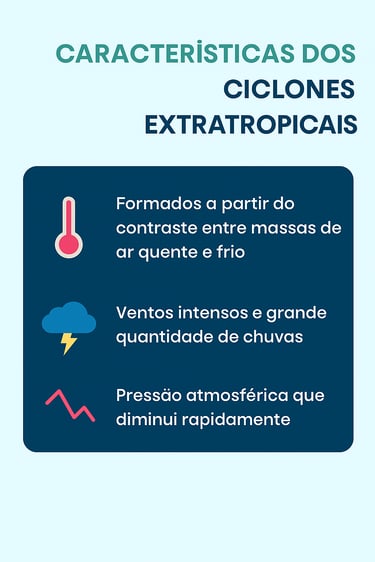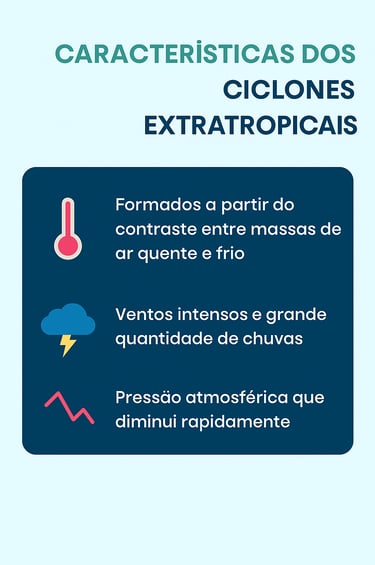 Os ciclones extratropicais apresentam um conjunto de características meteorológicas que os diferenciam de outros tipos de ciclones. A seguir, destacam-se os principais aspectos: