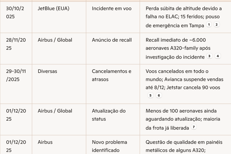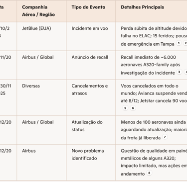 In the Brazilian context, the impact of the recall was minimal. Azul Linhas Aéreas reported that none of its A320 aircraft were included in the recall program announced by Airbus. Latam stated that flights in Brazil would not be affected, with impact limited to two flights of its Colombian affiliate.