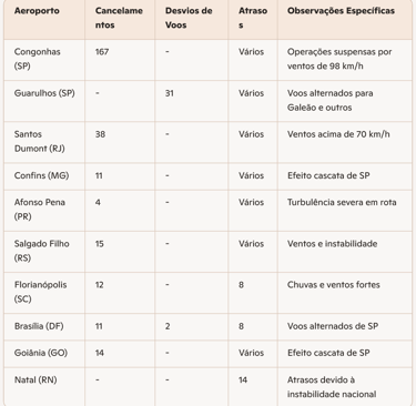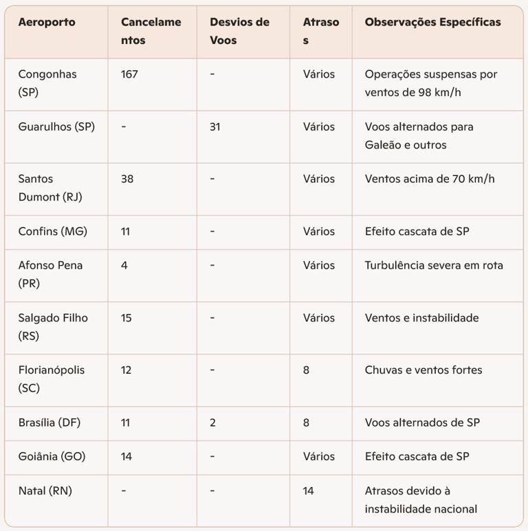 Cancellations and delays: In December 2025, Congonhas recorded 167 canceled flights in a single day, while Guarulhos had 31 flights diverted to other airports. The cascading effect impacted airports across the country, including Santos Dumont (RJ), Confins (MG), Afonso Pena (PR), Salgado Filho (RS), and others.