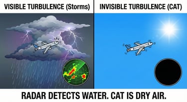 Unlike convective turbulence, which occurs inside Cumulonimbus clouds (thunderstorms) and is visible to both the naked eye and radar, CAT is stealthy. It happens in clear air, devoid of visual clues.