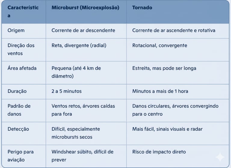 Apesar de ambos causarem destruição, microbursts e tornados são fenômenos distintos em sua origem, estrutura e padrão de danos. A tabela a seguir resume as principais diferenças: