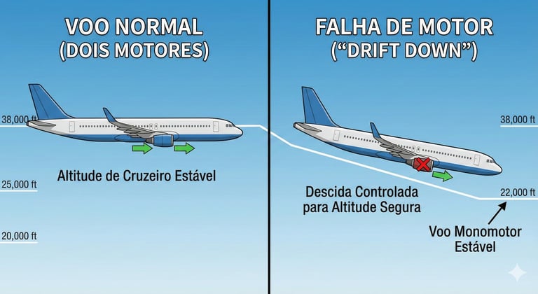 Quando um motor falha em cruzeiro, o avião perde 50% da sua potência, mas não 50% da sua capacidade de voar. O que acontece é um procedimento chamado "Drift Down" (descida controlada).